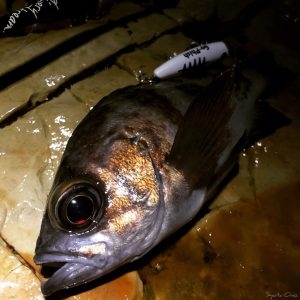 オルガリップレスを超スローで引いてると、10cm前後くらいの、めっちゃ小さいメバルが下からバンバン食ってきます。